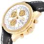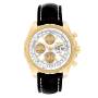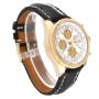 Dial: White dial with luminescent stainless steel outlined hands. Three gold chronograph subdials - 12 hours, 60 seconds, and 30 minutes. Date and day calendar window at 3 o'clock.