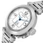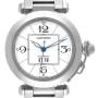 Cartier Pasha C Big Date Midsize Steel Mens Watch W31055M7. Automatic self-winding movement. Stainless steel round case 35.0 mm in diameter. Caseback with 8 screws. Screw-down crown cover. Stainless steel concave bezel. Scratch resistant sapphire crystal. White dial with black index hour markers. Luminescent blue diamond-shaped hands. Arabic numerals at 3, 6, 9, and 12 o'clock. Double date window above 6 o'clock. Stainless steel bracelet with hidden butterfly clasp. Fits up to a 7 1/4" wrist.