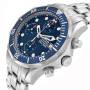 Omega Seamaster Blue Dial Chronograph Steel Mens Watch. Officially certified chronometer automatic self-winding movement. Chronograph function. Brushed and polished stainless steel case 41.5 mm in diameter. Helium escape valve at 10 o'clock. Omega logo on the crown. Blue unidirectional rotating bezel. Scratch resistant domed anti-reflective sapphire crystal. Blue wave decor dial with luminous skeleton hands and hour markers. Date window at 3 o'clock aperture. Three chronograph subdials - 60 seconds, 30 minutes and 12 hours. Brushed and polished stainless steel bracelet with folding clasp and diver's extension Fits 7.5" wrist.