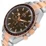 Omega Speedmaster Broad Arrow Steel Rose Gold Mens Watch. Automatic self-winding chronograph movement with column wheel mechanism and Co-Axial Escapement. Stainless steel and 18K rose gold round case 42.0 mm in diameter. Transparent exhibition sapphire crystal case back. Two pushers operate the chronograph functions. Omega logo on the crown. 18K rose gold bezel engraved with the tachymetre scale. Scratch-resistant sapphire crystal with anti-reflective treatment inside. Brown dial with luminescent rose gold broad arrow hands and baton hour markers. Three subdials - running small seconds and the 30-minute and 12-hour chronograph registers. Date calendar at the 6 o'clock aperture. Stainless steel and rose gold bracelet with a double push-button deployant clasp. Will fit up to an 8.5" wrist.