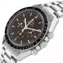Omega Speedmaster Brown Dial Steel Mens Moon Watch. Manual winding chronograph movement. Stainless steel round case 42.0 mm in diameter. Exhibition transparent sapphire crystal caseback. Stainless steel bezel with tachymeter function. Scratch-resistant sapphire crystal with anti-reflective treatment inside. Bold brown dial with luminous indexes and hands. Three chronograph sub-dials - 12 hours, 30 minutes, and small seconds. Brushed and polished stainless steel bracelet with push-button fold over clasp. Fits 8" wrist.