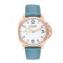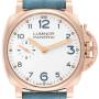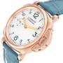 Panerai Luminor Due Rose Gold Ivory Dial Mens Watch PAM00741. Manual winding movement. Two part cushion shaped 18k rose gold case 42.0 mm in diameter. Panerai patented crown protector. Transparent exhibition sapphire crystal caseback. 18k rose gold sloped polished bezel. Scratch resistant sapphire crystal. Ivory dial with luminous rose gold hands and blue Arabic numeral hour markers. Small seconds subdial at the 9 o'clock position. Light blue alligator leather strap with 18k rose gold tang buckle.