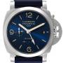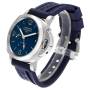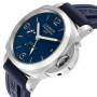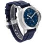 Panerai Luminor Marina 1950 10 Days GMT 44mm Watch PAM00986. Automatic self-winding movement. Two part cushion shaped stainless steel case 44.0 mm in diameter. Panerai patented crown protector. Transparent case back. Polished stainless steel sloped bezel. Scratch resistant sapphire crystal. Blue dial with luminous hands and stick hour markers. Arabic numerals at 6, 9 and 12 o'clock positions. Date calendar window at 3 o'clock aperture. Seconds and 24h indicator at 9 o'clock, linear power reserve indicator at 6 o’clock. Blue rubber strap with stainless steel tang buckle.
