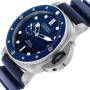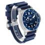 Panerai Submersible Quarantaquattro Blu Profondo Mens Watch. Automatic self-winding movement. Stainless steel cushion-shaped case 44.0 mm in diameter. Panerai patented crown protector. Blue ceramic unidirectional rotating time-lapse bezel with graduated scale. Scratch resistant sapphire crystal. Blue gradient dial with luminescent skeletonized sword-shaped hands and round hour markers. Seconds subdial at 9 o'clock . Date calendar at the 3 o'clock aperture. Blue rubber strap with a stainless steel tang buckle.