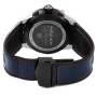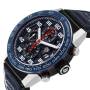 Bracelet: Blue leather strap with rubber backing and red stitching. PVD coated stainless steel deployant clasp.
