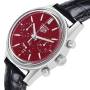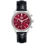 Dial: Red dial with raised index hour markers and luminescent hands. Three chronograph subdials -- runing seconds; 30 minute and 12 hour chronograph registers. Central chronograph seconds hand.