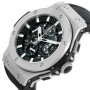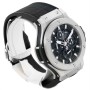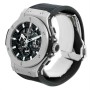 Case: Stainless steel case 44.0 mm in diameter. Exhibition case back. Black rubber inserts chronograph buttons and crown with the Hublot logo.