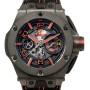 Dial: Skeleton black dial with raised brushed finished black nickel Arabic Numerals and index hour markers with red luminous fill. Raised/tapered inner bezel flange on the perimeter of the dial with printed minute/seconds track & applied red block 5 minute markers. Black nickel minute & hour hands with red luminous fill. Large red tipped central seconds counter. 60 minute counter sub-dial and date window with yellow background at 3 o'clock position. Ferrari 'prancing horse' figurine logo at the 9 o'clock.