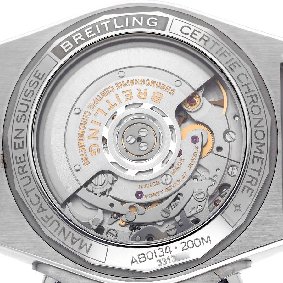 Replica Breitling Chronomat B01 Black Dial Steel Mens Watch AB0134. Self-winding automatic officially certified chronometer movement. Chronograph function. Stainless steel case 42.0 mm in diameter with screwed down crown and two pushers. Transparent exhibition sapphire crystal caseback. Stainless steel unidirectional rotating bezel. 0-60 elapsed time. Four 15-minute markers. Scratch resistant sapphire crystal. Black dial with baton hour markers. Three silver chronograph subdials - running small seconds, 30 minutes, and 12 hours. Luminous baton hands and hour markers. Tachymeter scale around the outer rim. Date display at 6 o'clock. Stainless steel bracelet with a double push-button double deployant clasp. Fits a 8 3/4" wrist.