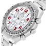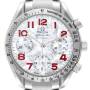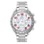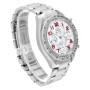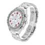 Dial: Mother of pearl dial with red Arabic numeral hour markers. Three chronograph subdials -- 60 seconds, 30 minutes, and 12 hours.
